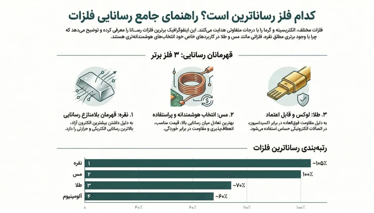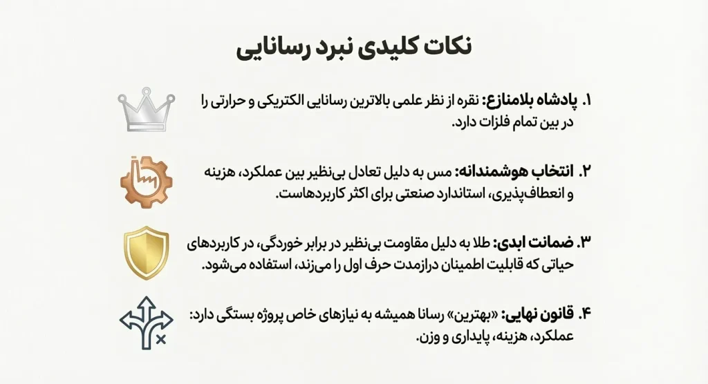 نکات کلیدی رساناترین فلزات نقره پادشاه رسانایی الکتریکی و حرارتی مس پادشاه انعطاف و قیمت طلا حرف اول مقاومت در برابر خوردگی قانون اخر بهترین همیشه به نیاز های پروژه بستگی دارد