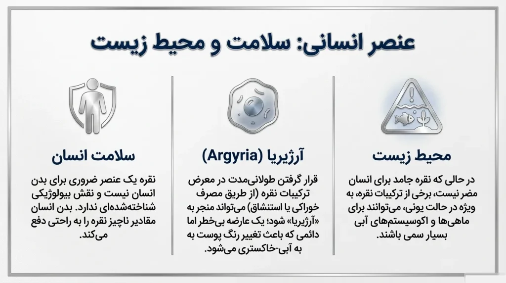 نقره خالص برای بدن انسان بیضرر است. با این حال، تماس طولانی با غبار یا ترکیبات نقره میتواند منجر به بیماری آرژیریا (تغییر رنگ پوست) شود که بیشتر جنبه زیبایی دارد تا سلامتی.