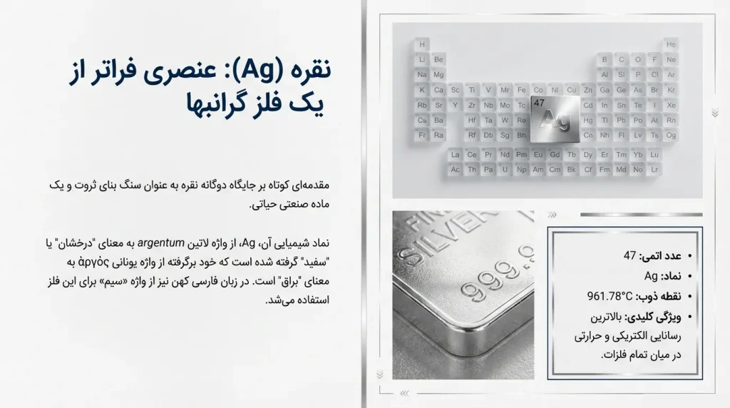 نقره (Ag) یکی از فلزات گرانبها و کاربردی در تاریخ بشر است که هم در صنایع مدرن و هم به عنوان دارایی سرمایه گذاری نقش مهمی دارد. این مقاله، یک مرجع جامع برای شناخت کامل نقره از جنبههای علمی، کاربردی و اقتصادی است. برای مطالعه بیشتر، به صفحه انس نقره چیست مراجعه کنید.