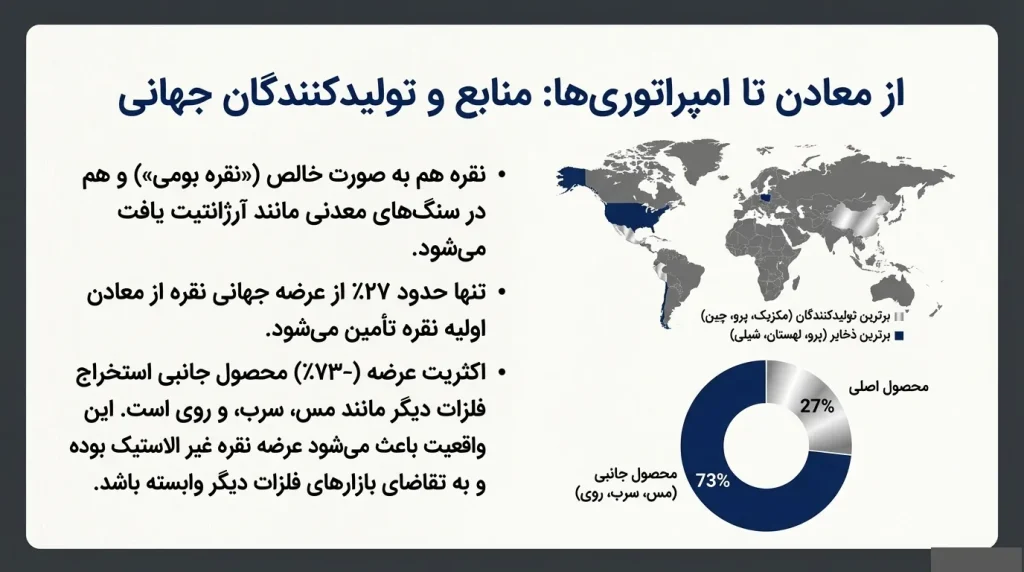 نقره بیشتر بهعنوان محصول جانبی استخراج فلزاتی مانند سرب، روی، مس و طلا بهدست میآید. منابع اصلی استخراج آن در مکزیک، پرو، چین، لهستان، استرالیا و آمریکا قرار دارند. همچنین بازیافت نقره از لوازم خانگی، الکترونیکی و جواهرات بخش مهمی از عرضه جهانی آن را تشکیل میدهد.