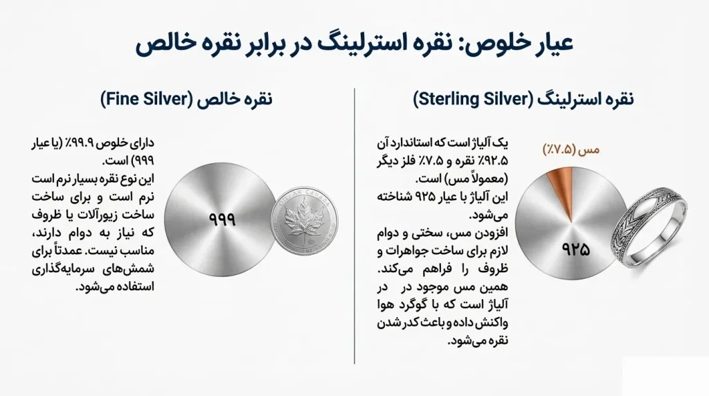 - نقره استرلینگ: ۹۲.۵٪ نقره + ۷.۵٪ مس (عیار ۹۲۵) – اطلاعات بیشتر درباره نقره استرلینگ